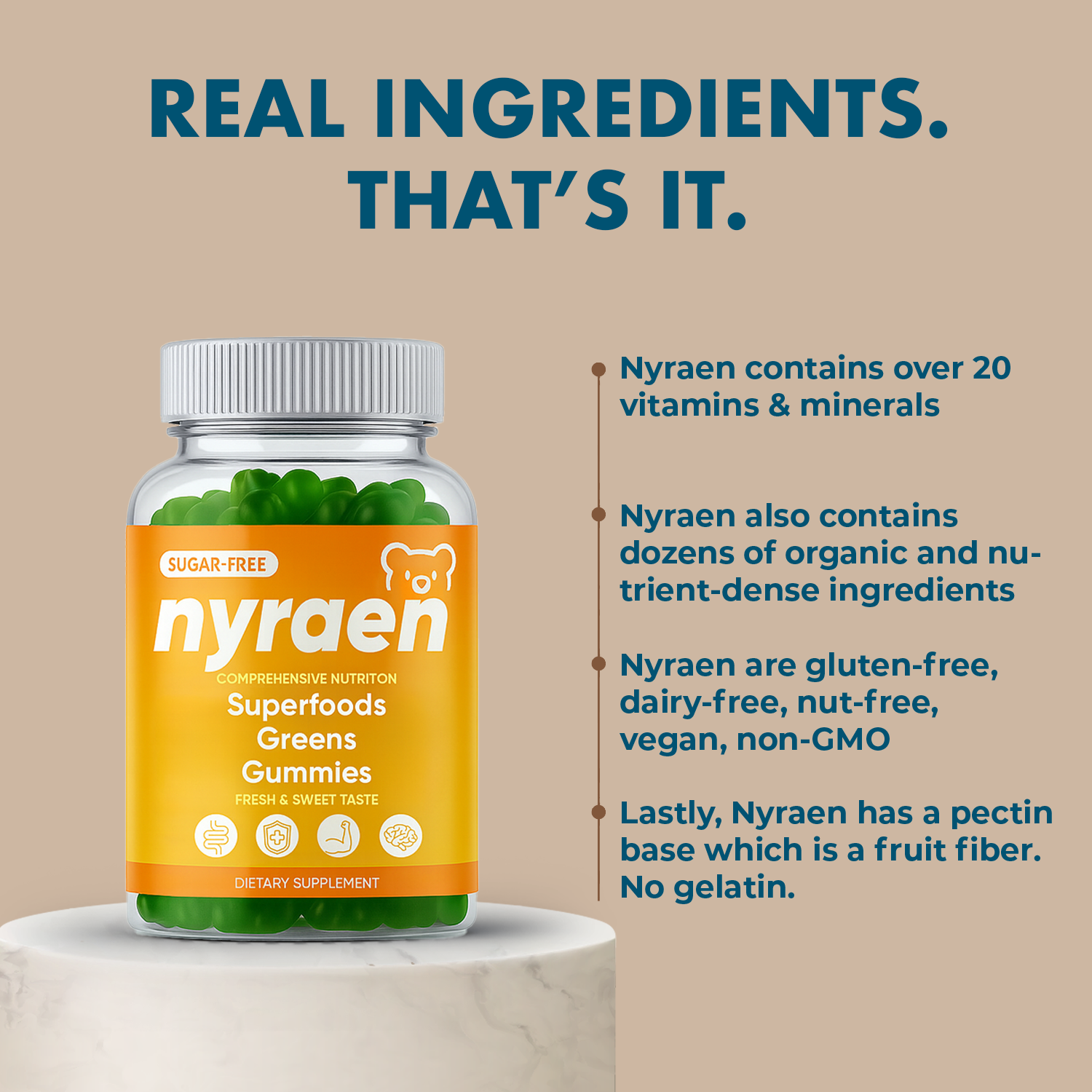 Nyraen contains dozens of organic and nutrient-dense ingredients such as whole-food fruits, vegetables, super mushrooms, prebiotics, adaptogens, and antioxidants. This long list includes organic alfalfa, organic kale, organic parsley, organic spinach, organic broccoli, organic cabbage, organic spirulina, organic astragalus, organic wheatgrass, organic chlorella, organic oat grass, organic beet, organic barley grass (gluten-free), organic lemon, organic apple, organic blueberry, organic raspberry, organic strawberry, organic tomato, organic acai, organic acerola, organic amla, organic cranberry, organic goji, organic jabuticaba, organic mangosteen, organic maqui, organic pomegranate, organic shiitake mushroom,, and organic inulin.